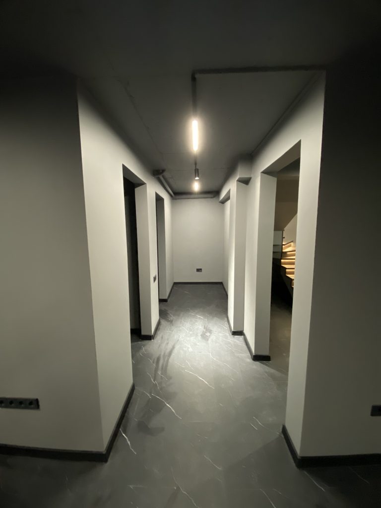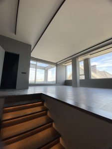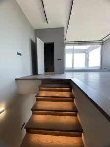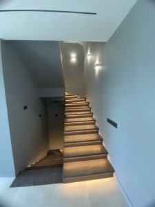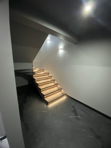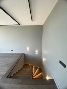 Scările interioare au fost complet refăcute, cu trepte finisate în lemn masiv și iluminare LED integrată, care adaugă profunzime și un efect vizual spectaculos pe timpul serii. Paleta cromatică a fost aleasă în tonuri neutre de gri, bej și alb, pentru a crea un ambient calm, coerent și contemporan. Iluminarea a fost gândită în detaliu — profile LED discrete, corpuri încastrate și accente calde care pun în valoare arhitectura interioară.