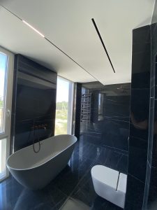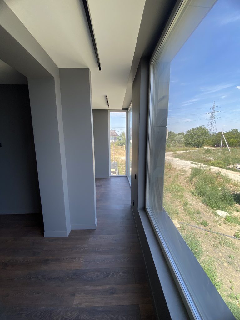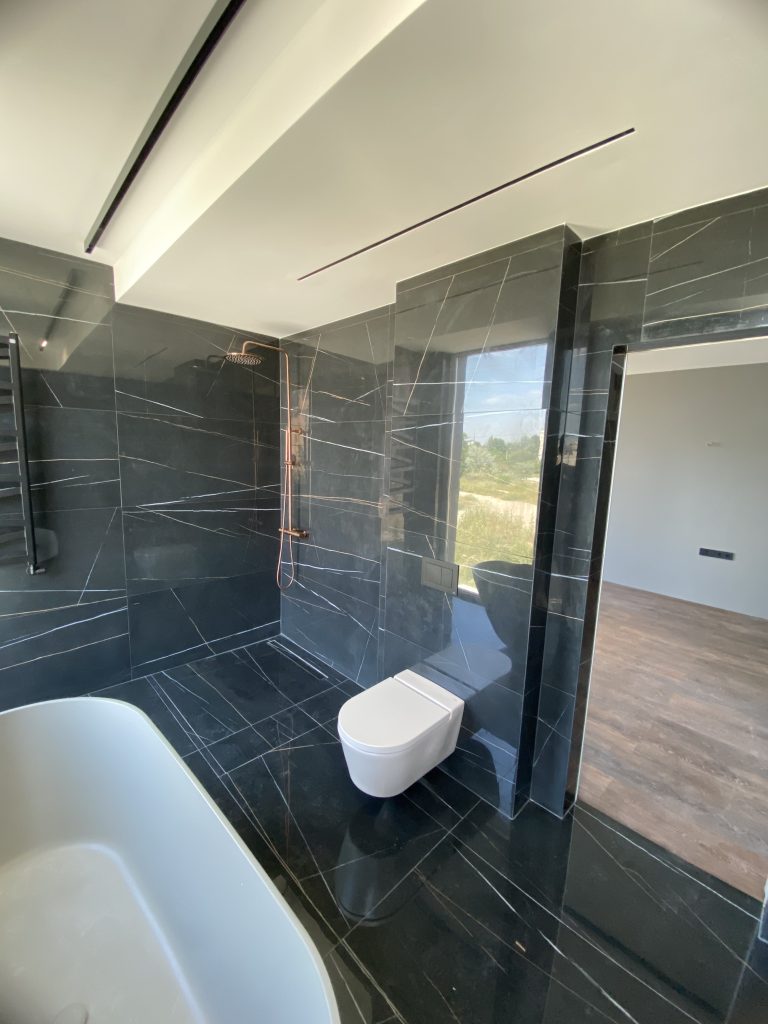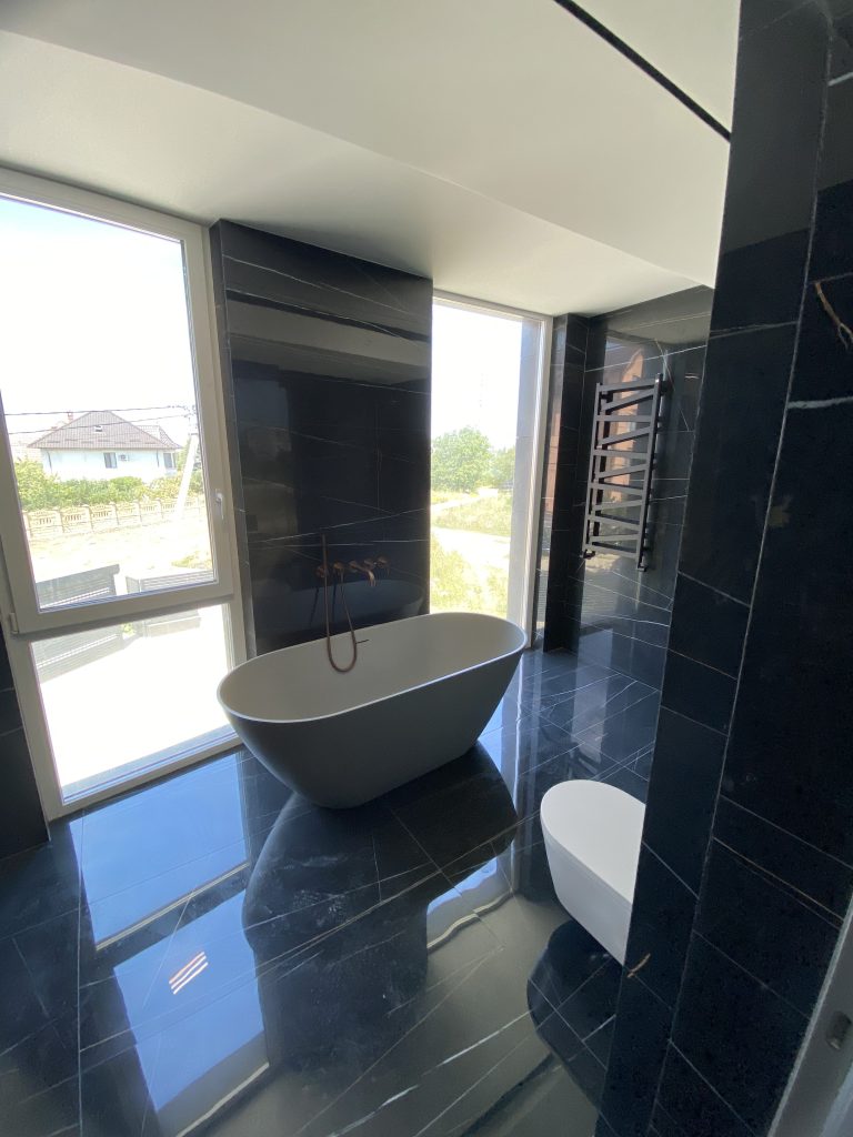 Băile au fost proiectate în stil modern, cu plăci ceramice negre lucioase și obiecte sanitare suspendate, iar detaliile minimaliste transmit o eleganță discretă. Dormitoarele și spațiile de zi beneficiază de lumină naturală abundentă datorită ferestrelor panoramice, care deschid perspectiva spre exterior.